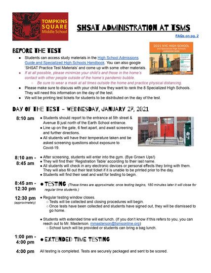 If you're an 8th grader or a grown up of an 8th grader and you have registered to take the SHSAT at TSMS, this post is for you! Test is Wednesday, January 27!